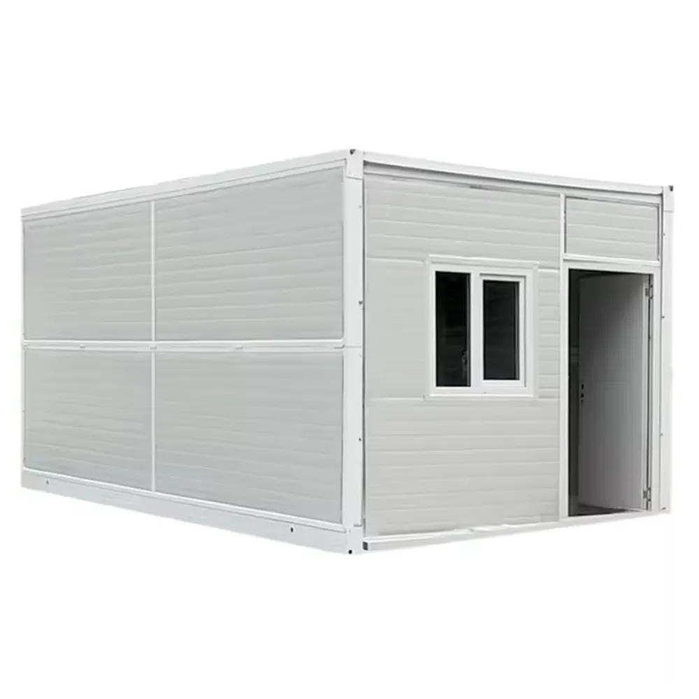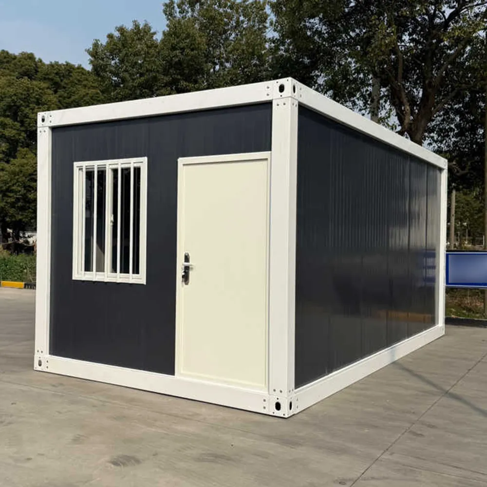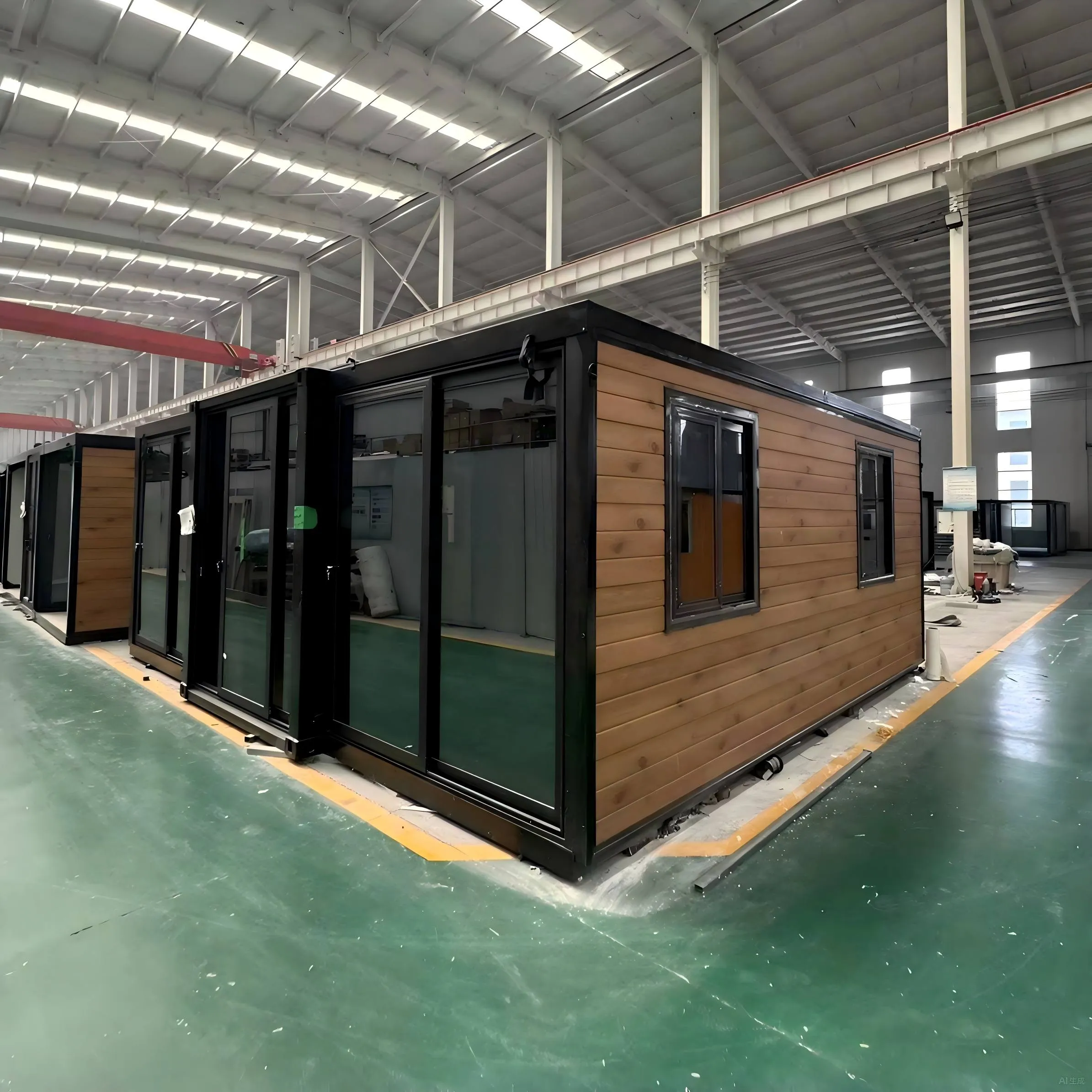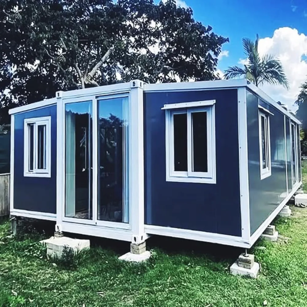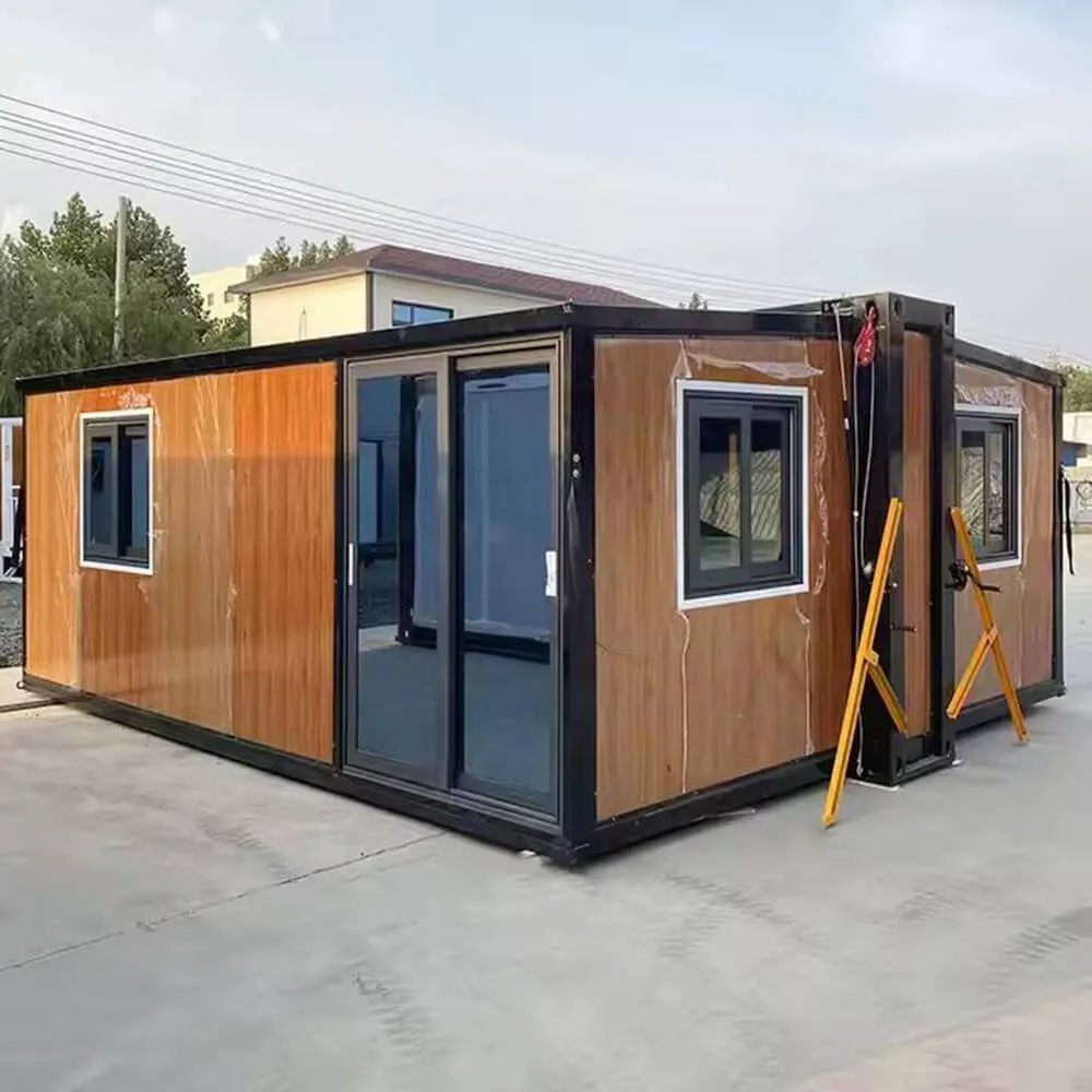 Contemporary expandable container house featuring a sleek dark frame and large glass doors. This model showcases a stylish wood-grain exterior finish and is built to meet Australian Building Standards.